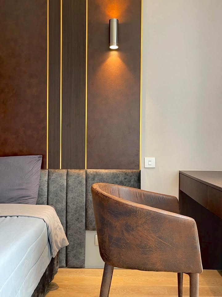 The bedrooms include a comfortable bed with an elegant headboard and ambient lighting, complemented by a stylish desk and chair.