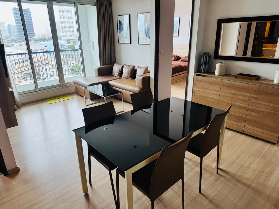 This sophisticated two-bedroom flat, located on the 10th floor of Building S in Rhythm Sathorn, spans 66.37 square metres and offers stunning views of the Chao Phraya River.