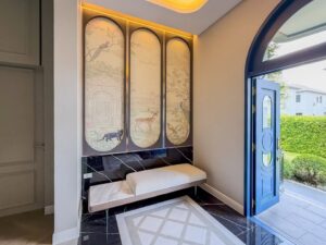 The grand foyer boasts black marble flooring, a beige bench, and floral wallpaper. The living area showcases a high ceiling, herringbone wooden floors, a crystal chandelier, a white sofa set, a Yamaha upright piano, and an electric fireplace.