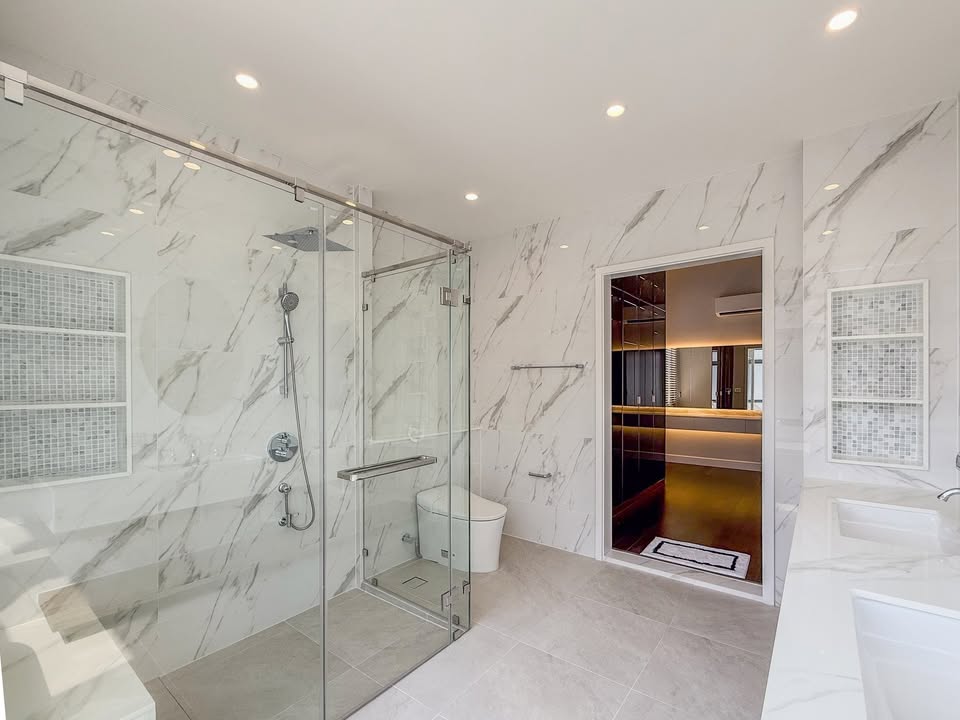 Bathrooms are luxurious with marble finishes, smart toilets, and rainfall showers.