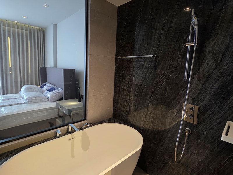 The luxurious bathroom boasts a freestanding bathtub, a smart toilet with a Villeroy & Boch washlet for added comfort and hygiene, a refreshing rainfall shower, and a sophisticated marble vanity, all finished with elegant dark marble walls and warm beige tiles.