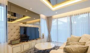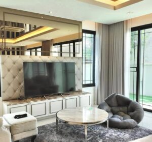 This spacious 460-square-metre, 4-bedroom house at The Pavilla (Private Residences) Bangbon 3 is a ready-to-move-in family home, set on a generous 126-square-wah plot with the front facing north, ensuring a cooler and shaded orientation.