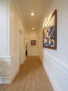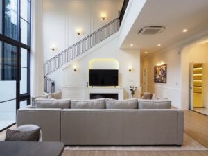 With high ceilings, expansive windows, and contemporary design, the villa includes a grand living area with a fireplace, a stylish staircase, and a walk-in wardrobe with illuminated shelving.