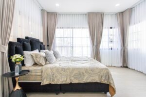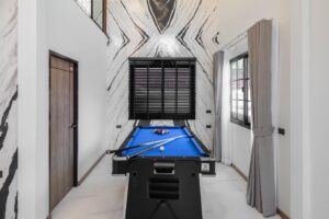The villa includes two expansive living rooms with high ceilings and polished hardwood flooring, creating an airy and elegant atmosphere for relaxation or entertaining guests.
