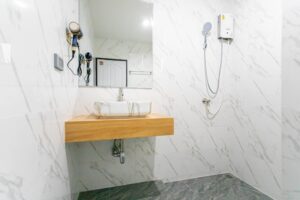 A unique tea room, designed with minimalist décor and serene tones, provides a tranquil space for quiet moments.