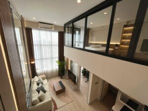 This stunning duplex 1-bedroom corner unit at KnightsBridge Prime Sathon, located on the 31st floor, offers a spacious 58-square-metre living space with 1 bedroom, 1 bathroom, and a contemporary design.