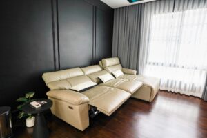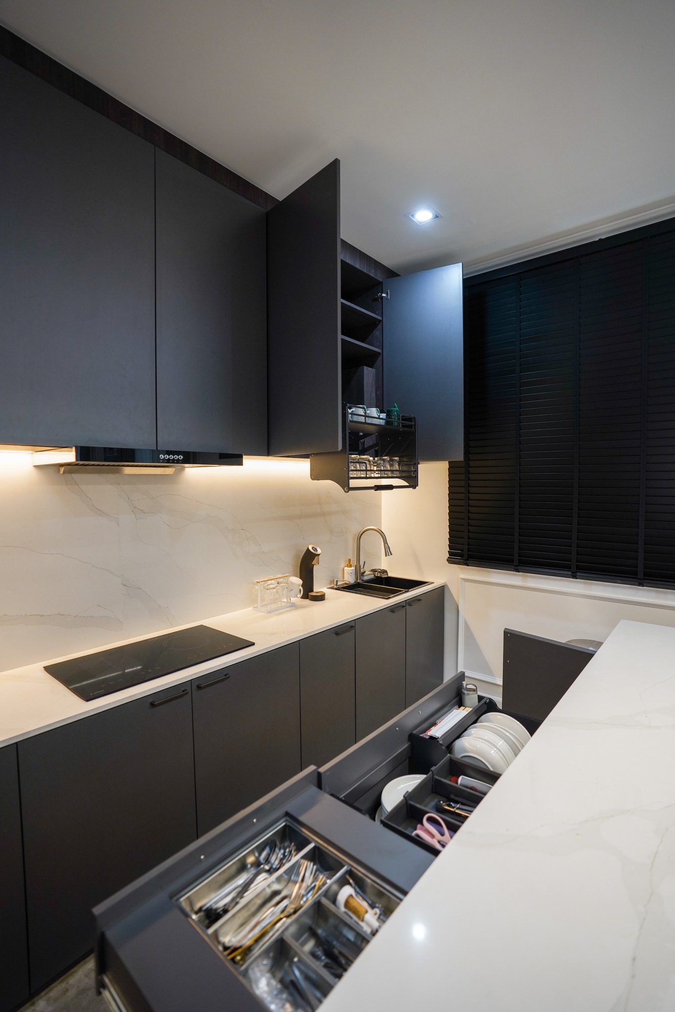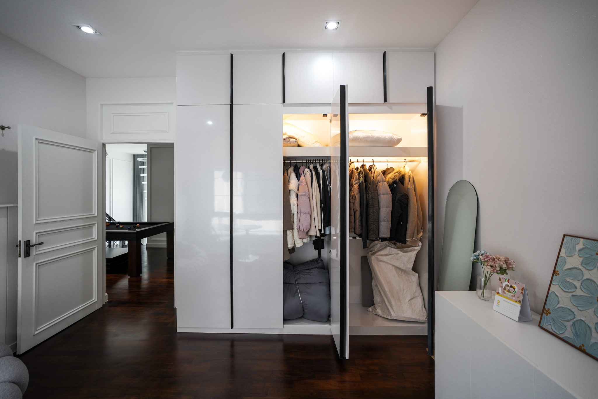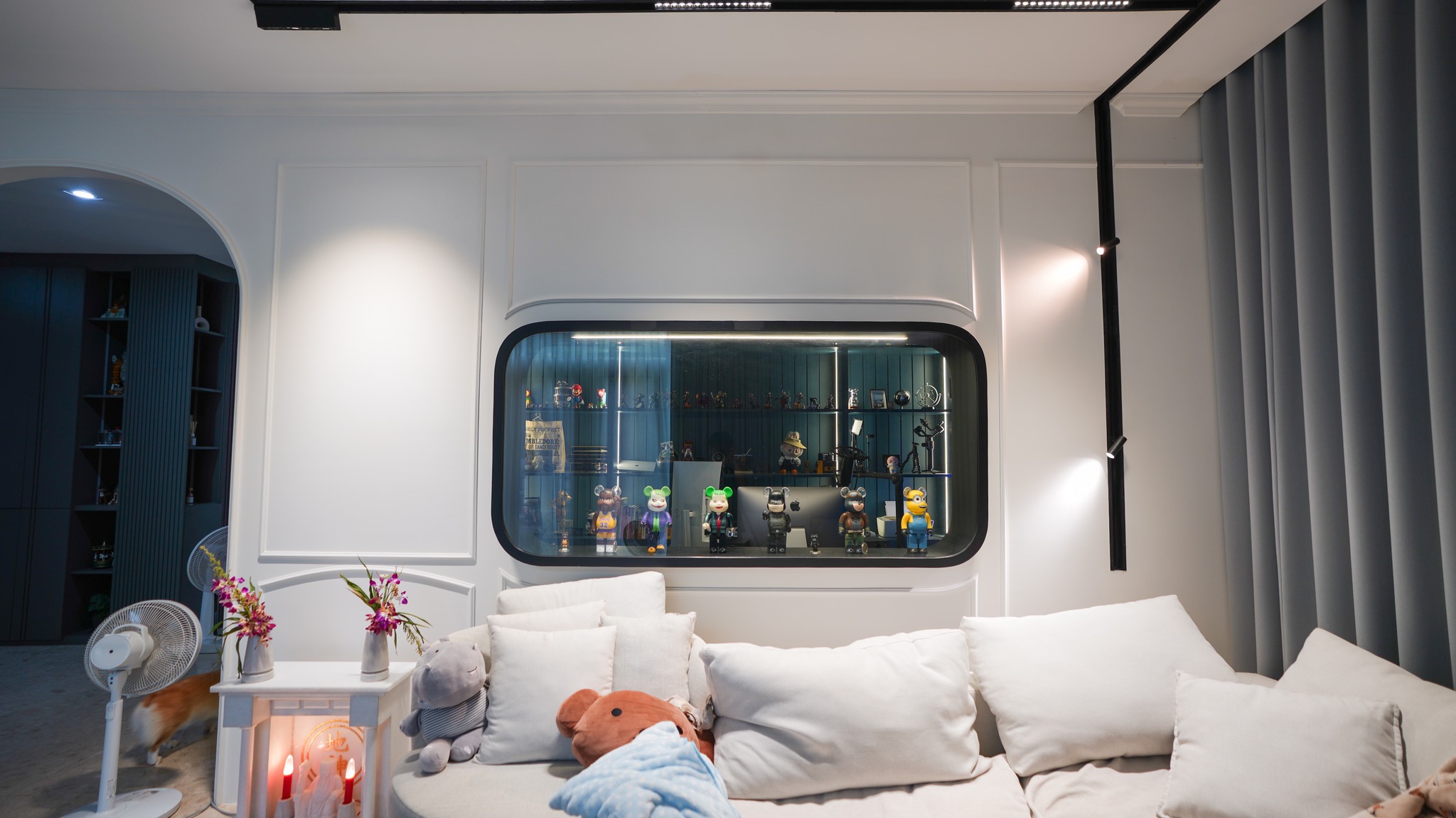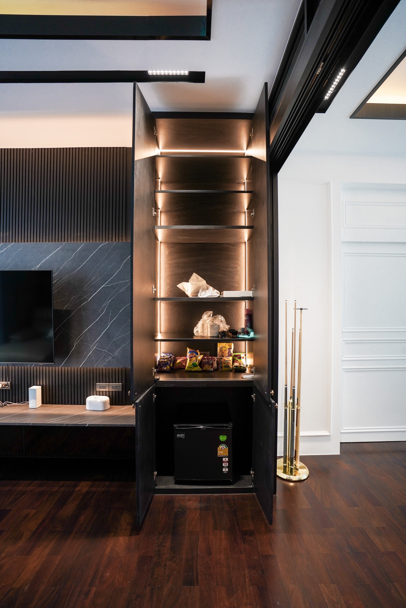 The living rooms are furnished with custom-made sofas, a sleek glass-top coffee table, modern shelving units, and a built-in entertainment unit, creating ideal spaces for relaxation or entertaining.