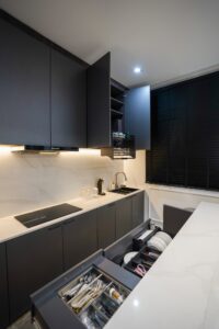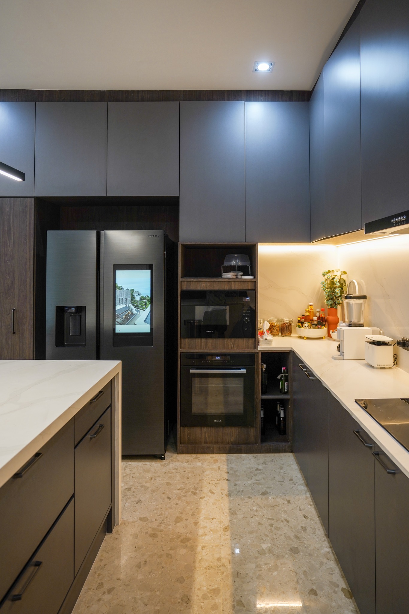 The Western kitchen is fitted with a refrigerator, microwave, oven, electric stovetop, and a central island with a breakfast bar, while the Thai kitchen includes a gas stove, a double sink, and additional storage for heavy-duty cooking, with a sliding door leading to a small outdoor utility area.