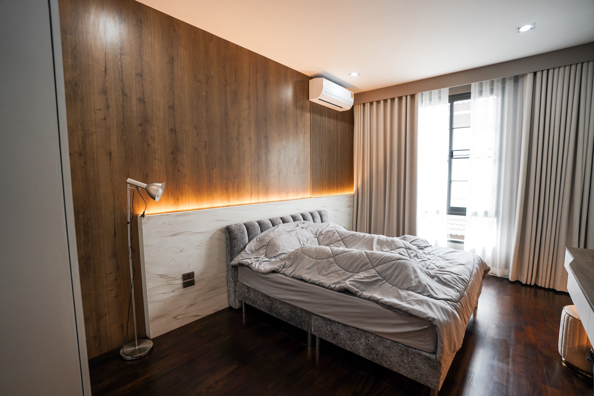 The property is equipped with 10 air-conditioning units (4 cassette type, 5 wall type, 1 wall-mounted), 4 Samsung televisions, 4 water heaters, and custom-made furniture, including Omazz mattresses on all beds, a dining table with matching chairs, and additional décor pieces like wall art, ambient lighting, and potted plants that add a touch of nature indoors.