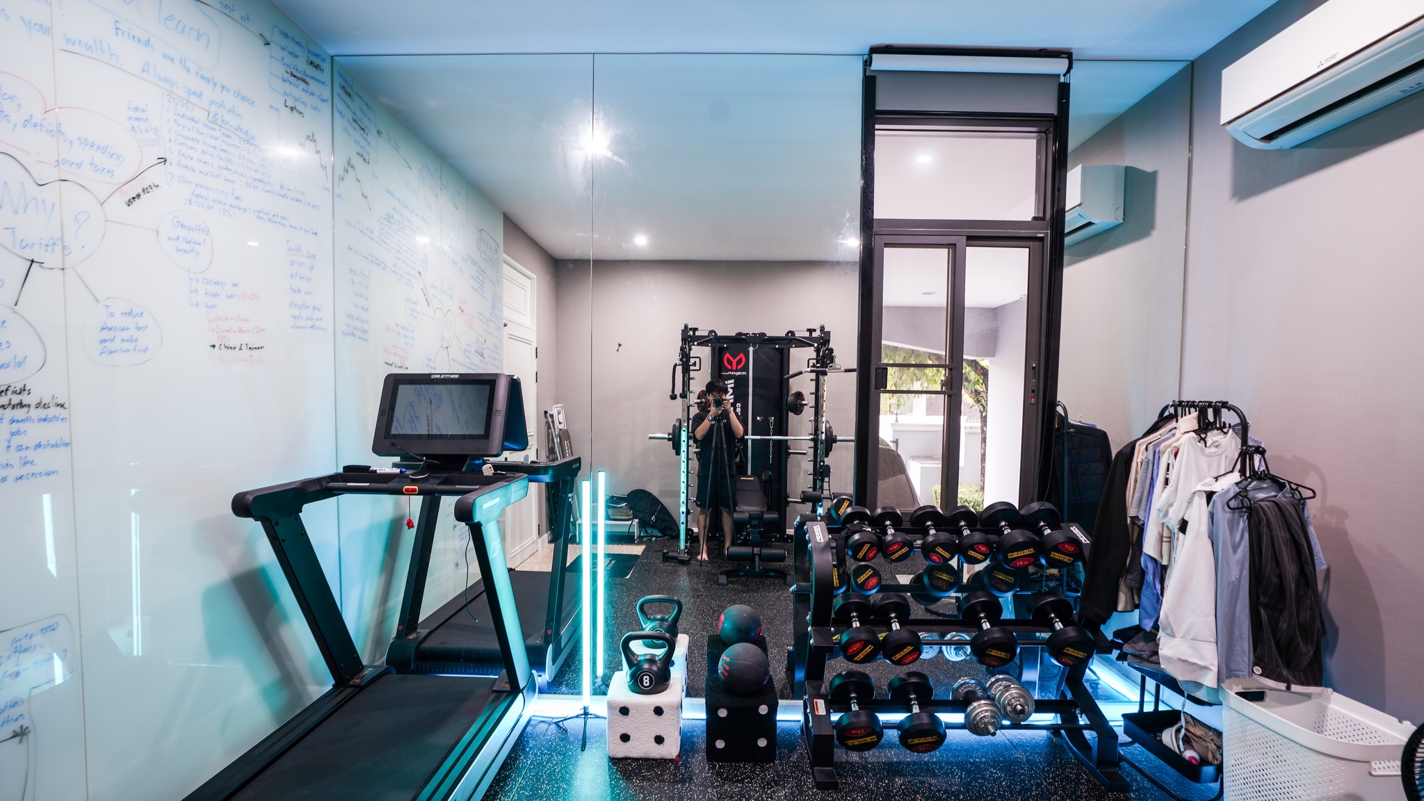 The home gym is equipped with mirrored walls, rubber flooring, and a ceiling fan for comfort during workouts.