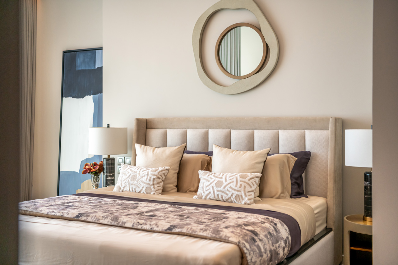 The bedroom is elegantly furnished with a plush bed featuring a sophisticated tufted headboard, complemented by beige bedding accented with patterned cushions, and two modern bedside tables each with a stylish lamp. A chic round wall mirror and tasteful abstract artwork add to the refined ambiance.
