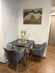 This one-bedroom flat is available for rent at 39,000 THB per month, with terms requiring a minimum one-year lease, one month’s advance rent, and a two-month deposit.