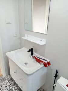 The bathrooms are modern, equipped with white fixtures, patterned tiled floors, and glass showers.