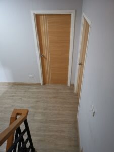 The interior also features wooden staircases with black railings, a tiled balcony with a view of the nearby expressway, and parking space for 2 cars.