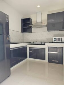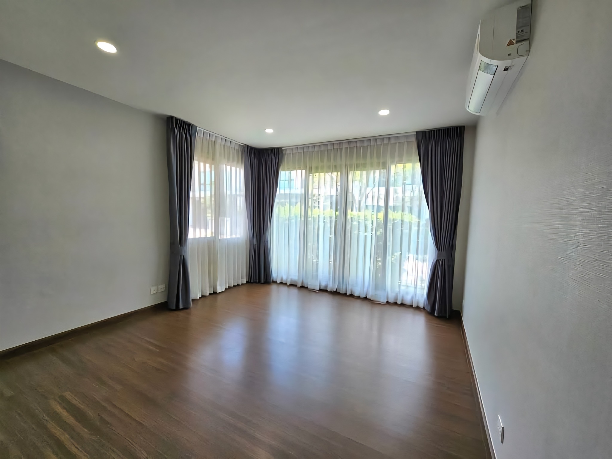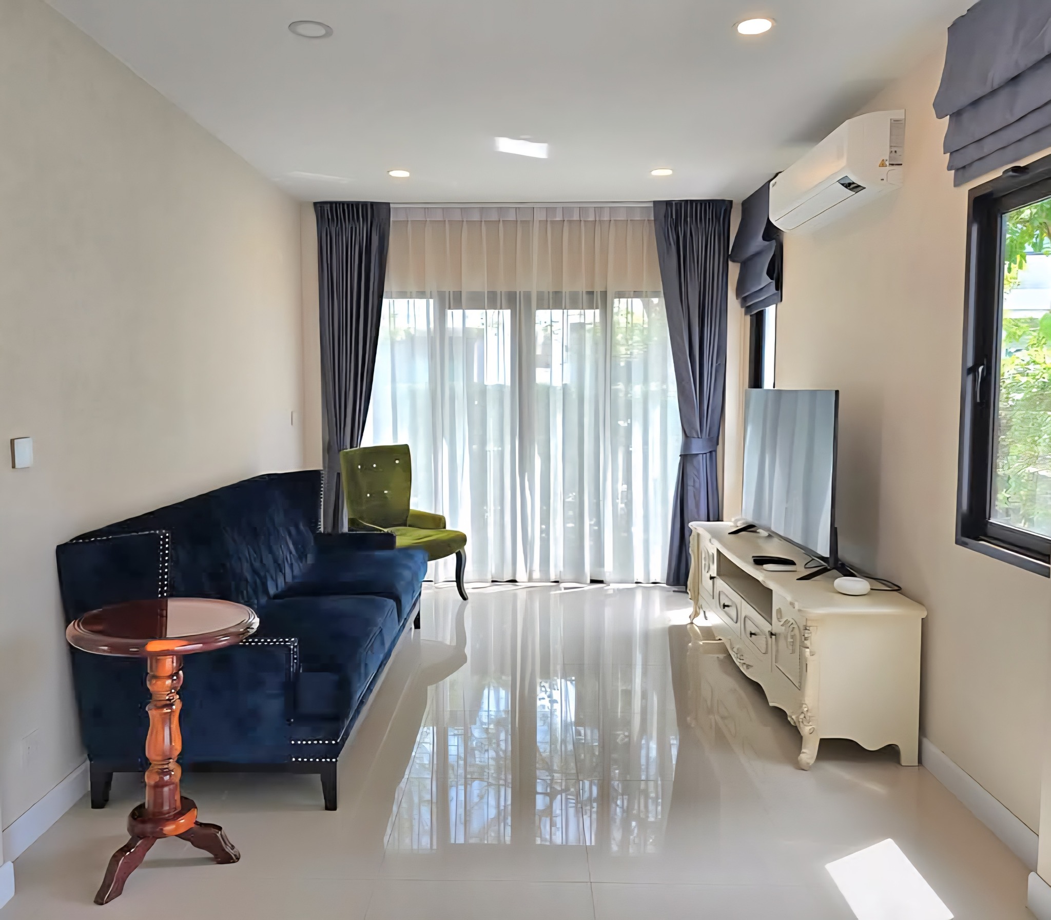 The house is equipped with 7 air conditioning units, 3 bedroom sets with beds and mattresses, wardrobes, a television cabinet, a sofa, and a dining table.